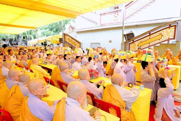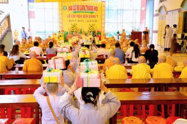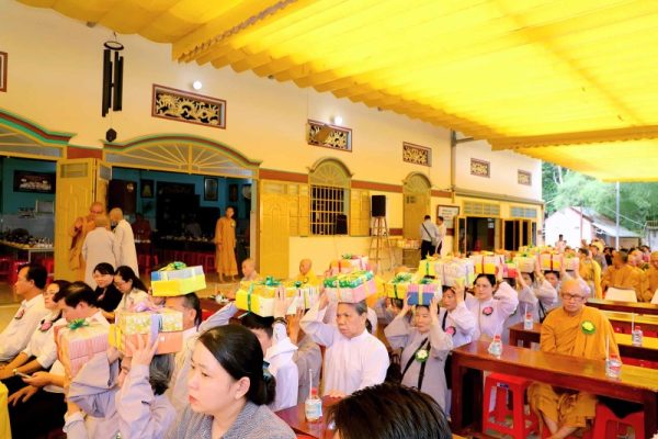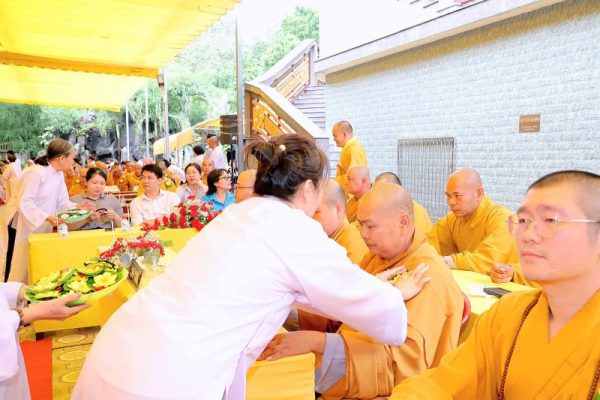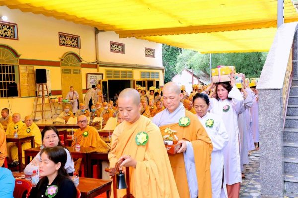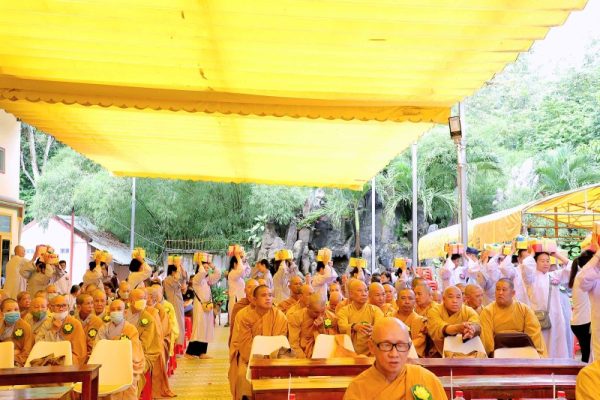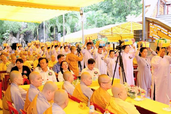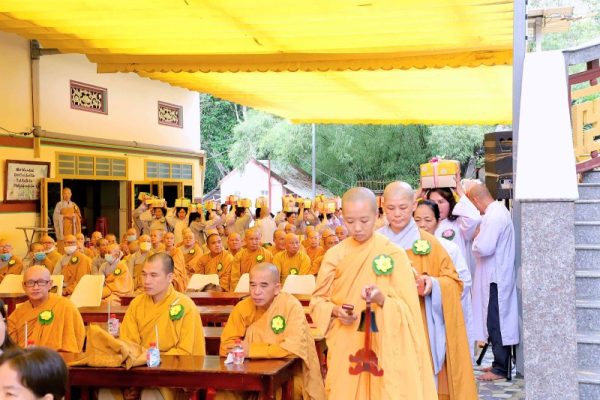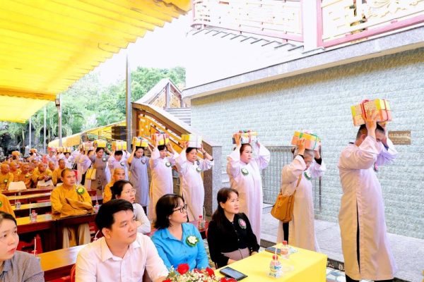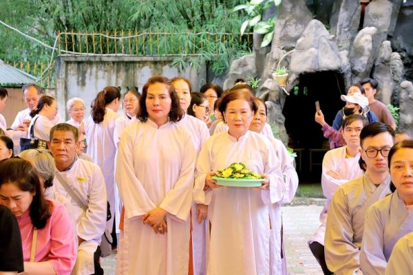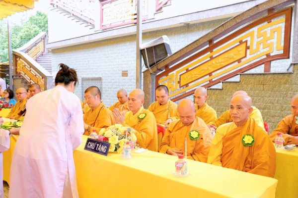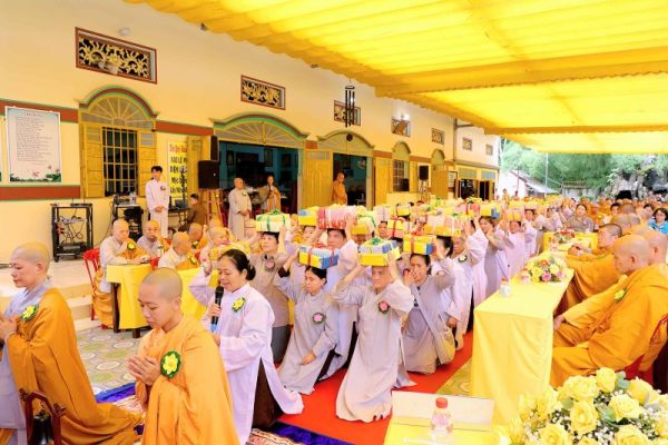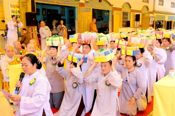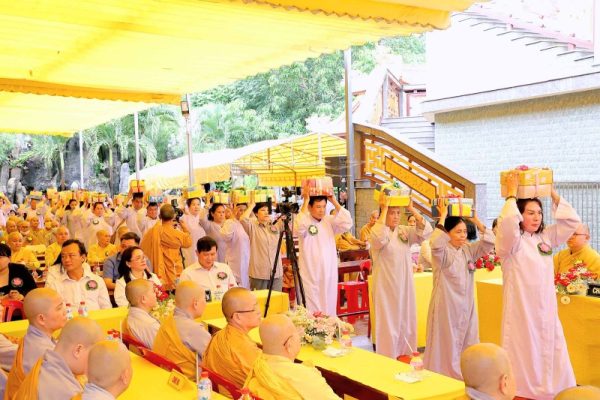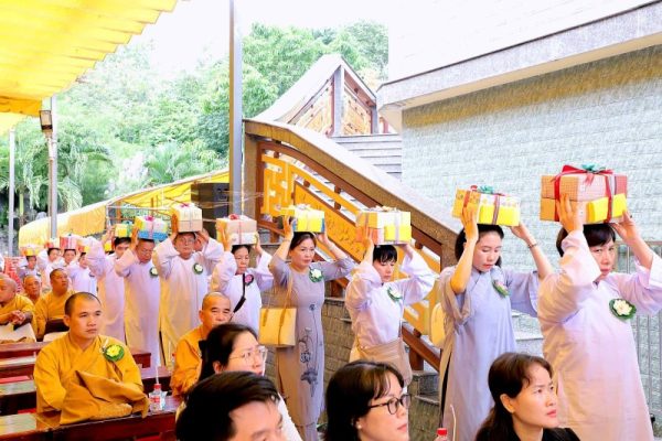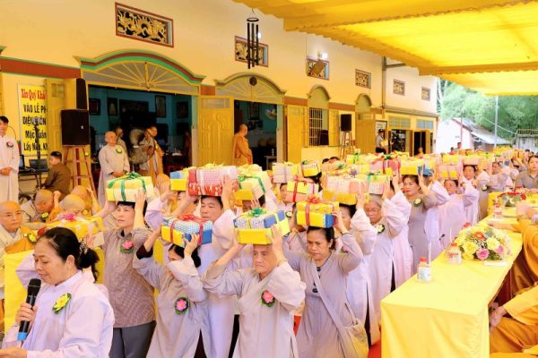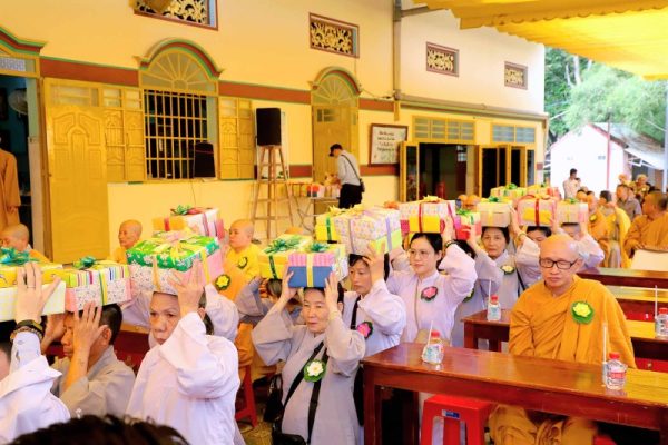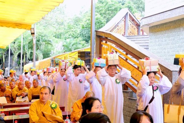 Trong giờ phút linh thiêng khắc sâu hình ảnh cao đẹp về ân đức sinh thành, dưỡng dục của hai đấng nghiêm từ, các Phật tử thực hiện nghi thức hữu nhiễu dâng y trong tiếng trì tụng bài Sám Vu Lan của chư Tôn đức. Theo đó, đại diện hàng Phật tử tại Tịnh xá thành kính dâng lời tác bạch cúng dường pháp y, kính mừng khánh tuế chư Tôn đức thêm một tuổi đạo.