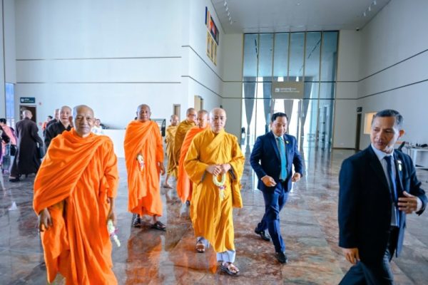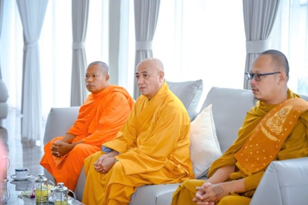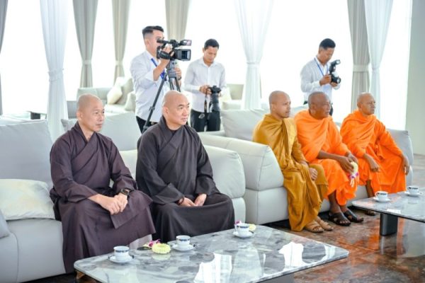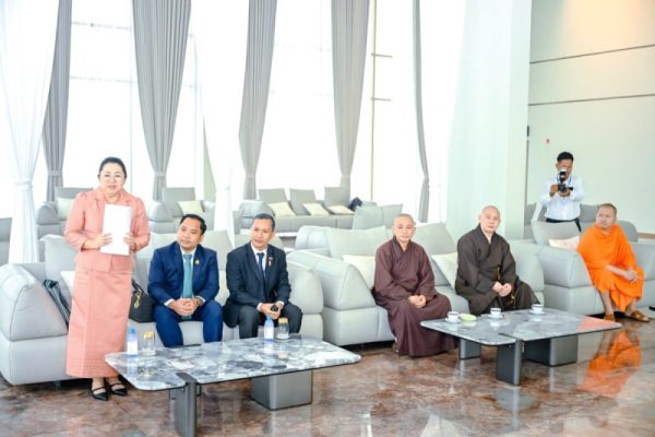 Đón tiếp đoàn tại Phòng VIP có bà Min Chandyneth, Thứ trưởng Bộ Lễ nghi và Tôn giáo Campuchia, cùng các cán bộ cấp cao của Bộ. Thứ trưởng Min Chandyneth hoan hỷ chào mừng đoàn đại biểu cấp cao của Trung ương Giáo hội, đồng thời giới thiệu khái quát chương trình làm việc của Hội nghị, diễn ra tại Thủ đô Phnom Penh từ ngày 27 đến 29-10-2025, với chủ đề “Sự hòa hợp của Phật giáo vì hòa bình và phát triển bền vững”.