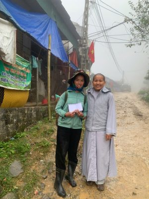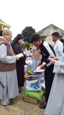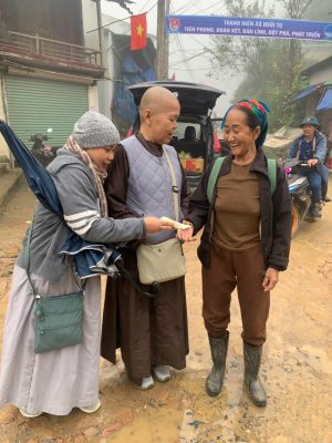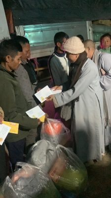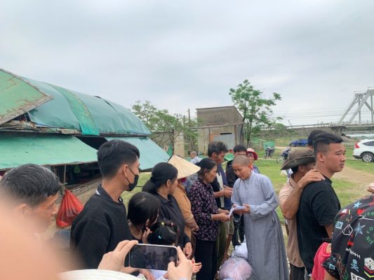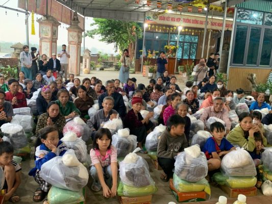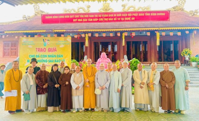 Tại Chùa Vịnh, Can Lộc, Hà Tĩnh chia sẻ yêu thương với 30 phần đến bà con bị ảnh hưởng bởi những trận bão lũ vừa qua. Và điểm cuối cùng của chuyến đi, đoàn trao 100 suất quà chứa đựng lòng từ bi, hơi ấm của tình đồng bào mà chư Tôn đức Ni Phân ban Ni giới khu vực Bình Dương cũ muốn gửi trao – để trong gian khó, bà con vẫn thấy được ánh sáng của tình người, mỗi phần trị giá 1.200.000 đồng tại Chùa Phúc Cung xã Trung Phúc Cường, huyện Thiên Nhẫn cũ, Nghệ An.