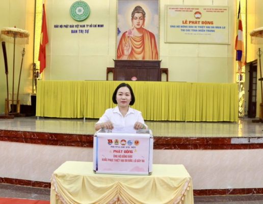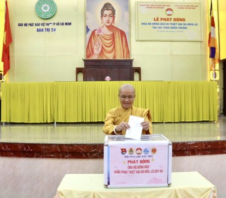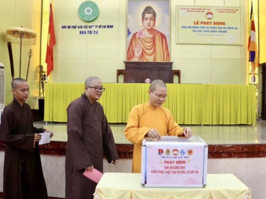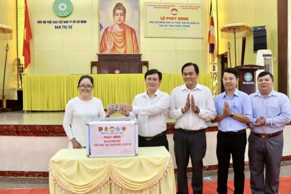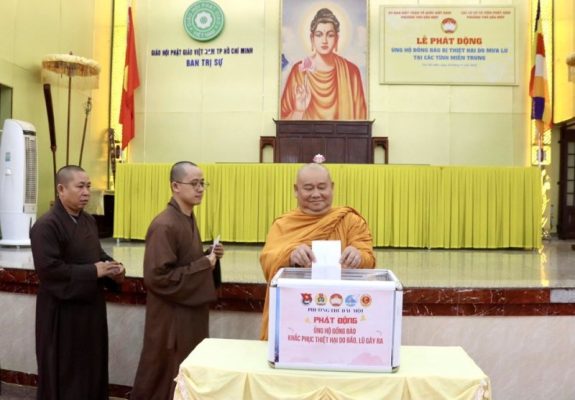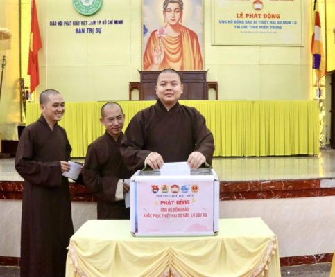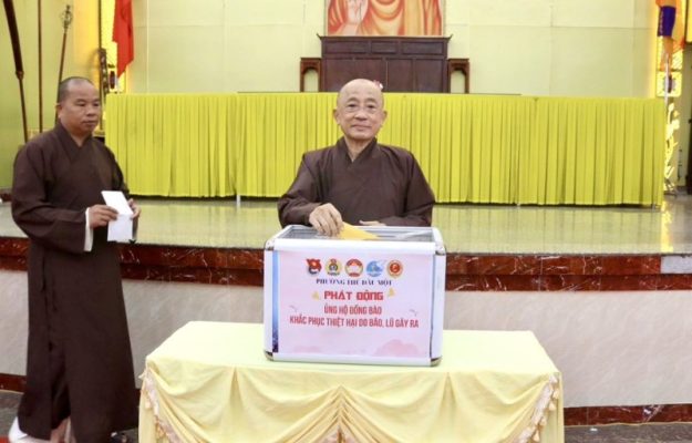 HT. Thích Huệ Thông – Phó Chủ tịch HĐTS, Trưởng ban Pháp chế Trung ương, Cố vấn Ban Trị sự GHPGVN TP.Hồ Chí Minh, Trụ trì Tổ đình Hội Khánh chung tay đóng góp, hỗ trợ đồng bào vùng lũ